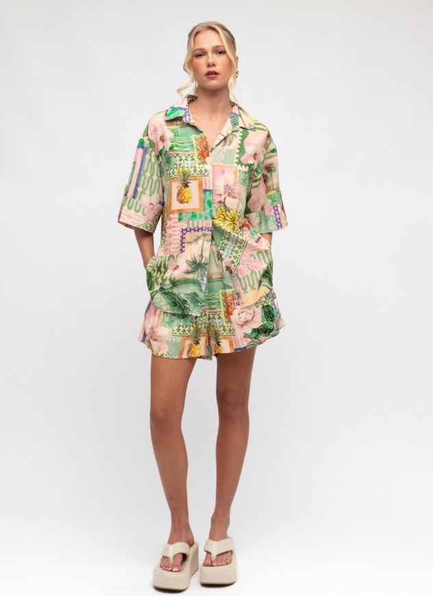 The Sao Paulo Set by Paper Heart is your ultimate summer statement. Crafted from a breathable rayon-linen blend, this two-piece features a relaxed button-up shirt with a collared neckline, half sleeves with button detail, and a breezy oversized fit. The matching shorts are designed with an elastic waist and side pockets, combining comfort and practicality with effortless style. Showcasing a vibrant tropical print of palms, florals, and sun-washed hues, this set radiates beachy, resort-ready vibes. Wear together with slides or platform sandals for an easy vacation look, or mix and match with denim or basics for versatile everyday styling.