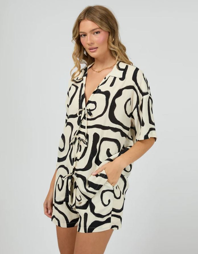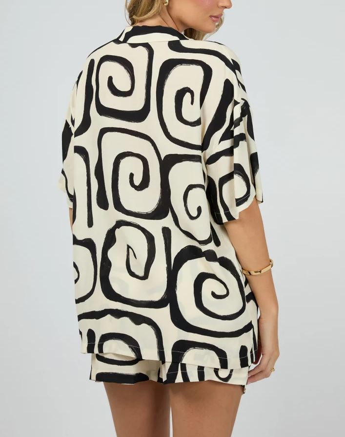 Easygoing style meets effortless cool with the Romee Shirt by Jorge. Crafted from 100% viscose, this lightweight and breathable piece is perfect for laid-back days with a touch of statement style. Featuring a relaxed fit, collared neckline, and bold black-and-off-white swirl print, it’s designed to stand out while keeping you comfortable. The tie-up front adds a playful, modern twist, making it an easy throw-on piece for any occasion. Pair with the matching shorts for a coordinated look or style with your favourite denim for everyday chic. Ideal for brunch dates, beach strolls, or summer getaways.
