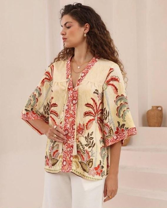 Introducing the Sahara Blossom Blouse by Iris Maxi, a relaxed and effortlessly stylish piece with a warm, bohemian feel. Featuring a soft cream base with intricate botanical and floral patterns in rich earthy tones, this blouse brings a beautiful touch of colour and detail to any outfit. The flattering V neckline and relaxed silhouette create an easy, comfortable fit, while the wide sleeves add movement and a soft, floaty look. Light and breathable, it drapes beautifully on the body without clinging. Pair it with crisp white denim, linen pants, or your favourite jeans for a relaxed yet polished look perfect for everyday wear or weekend outings.